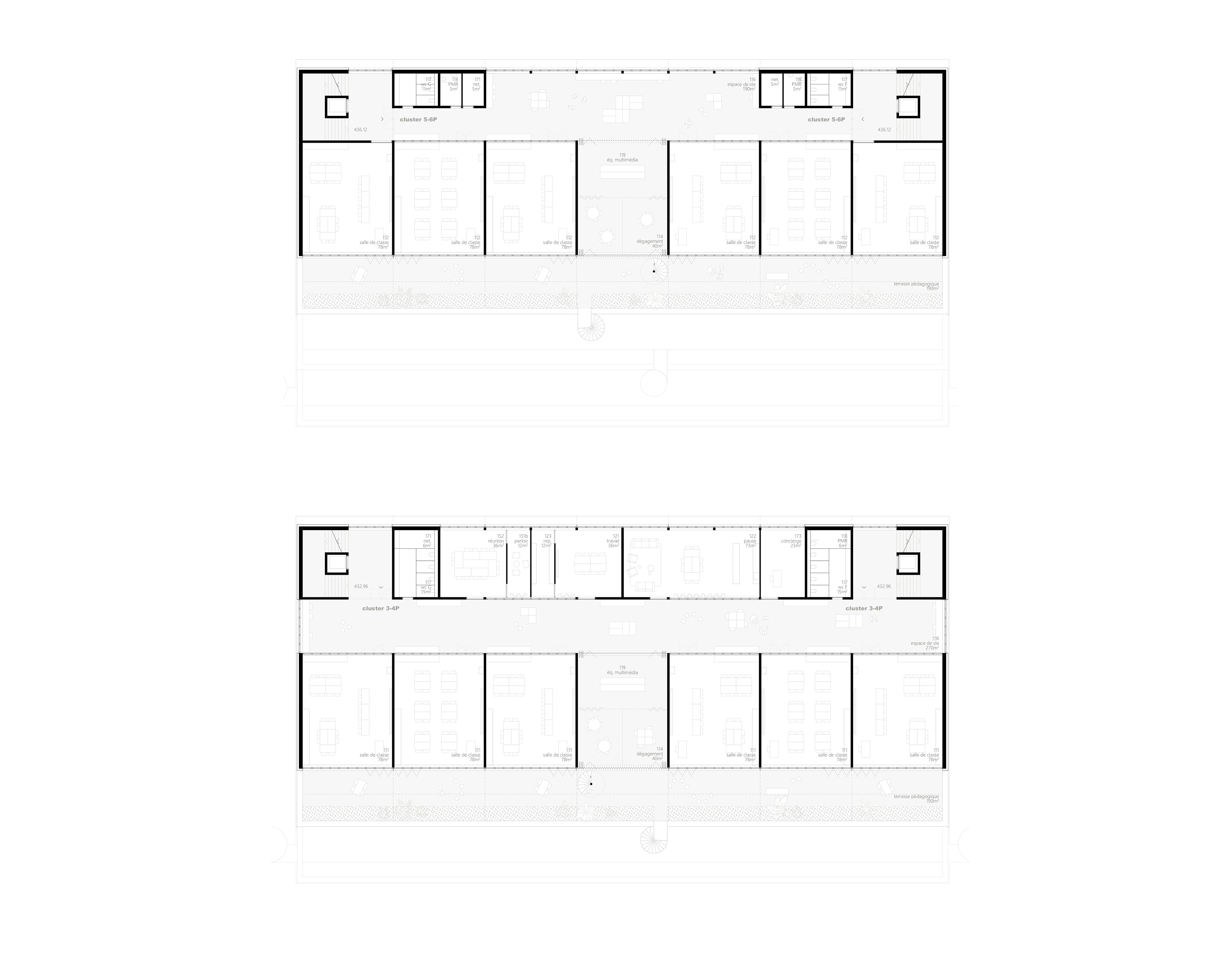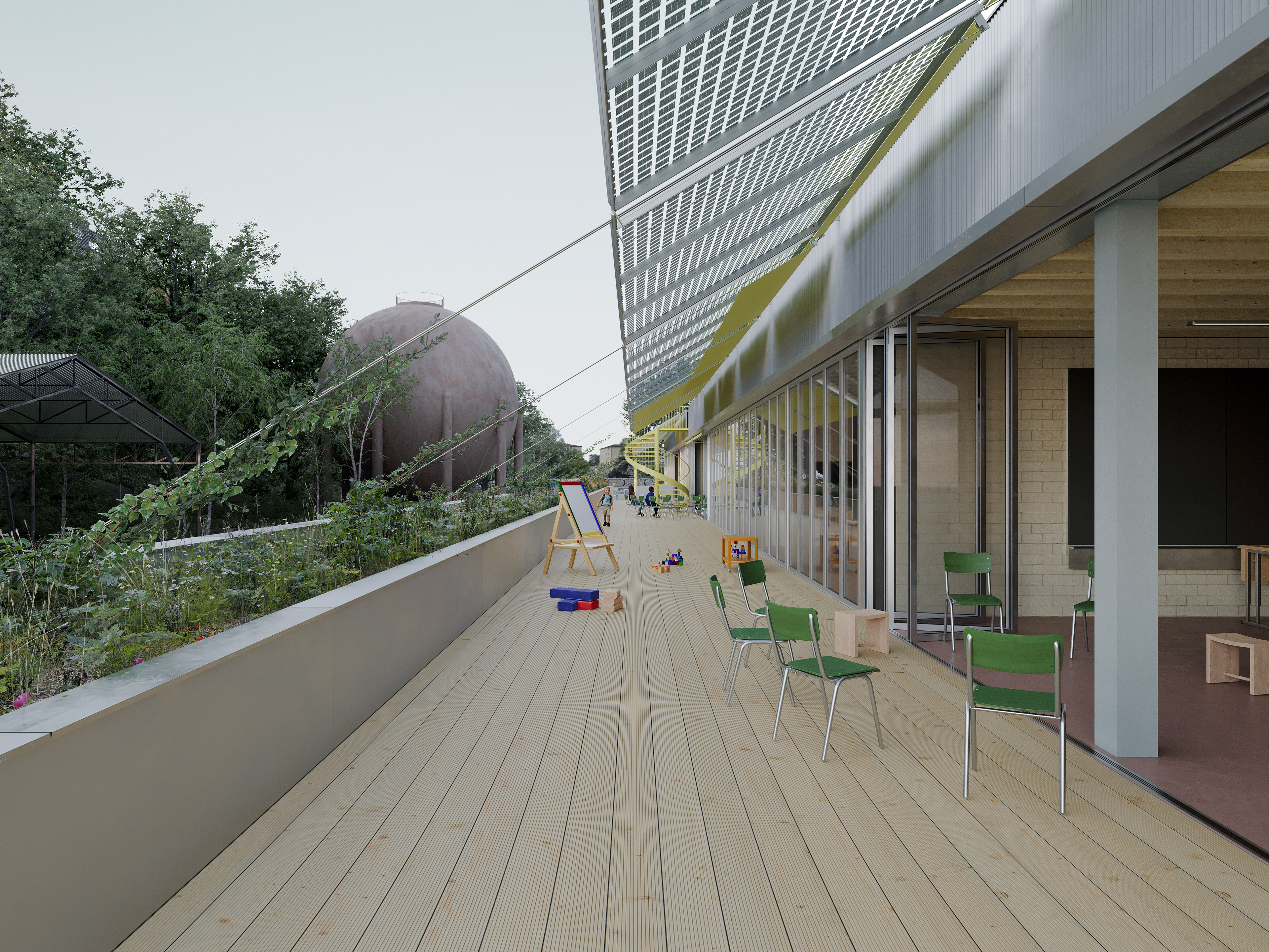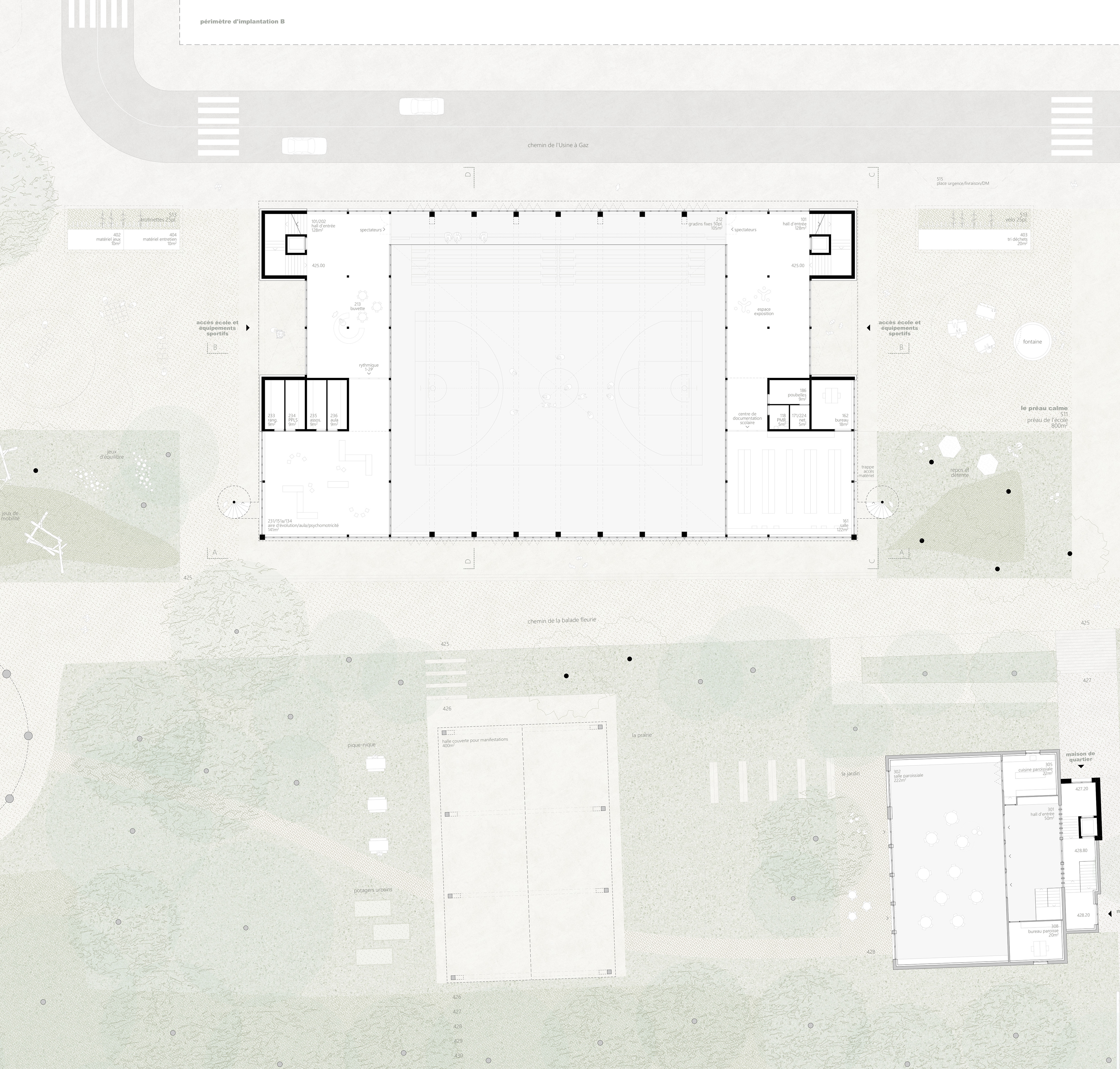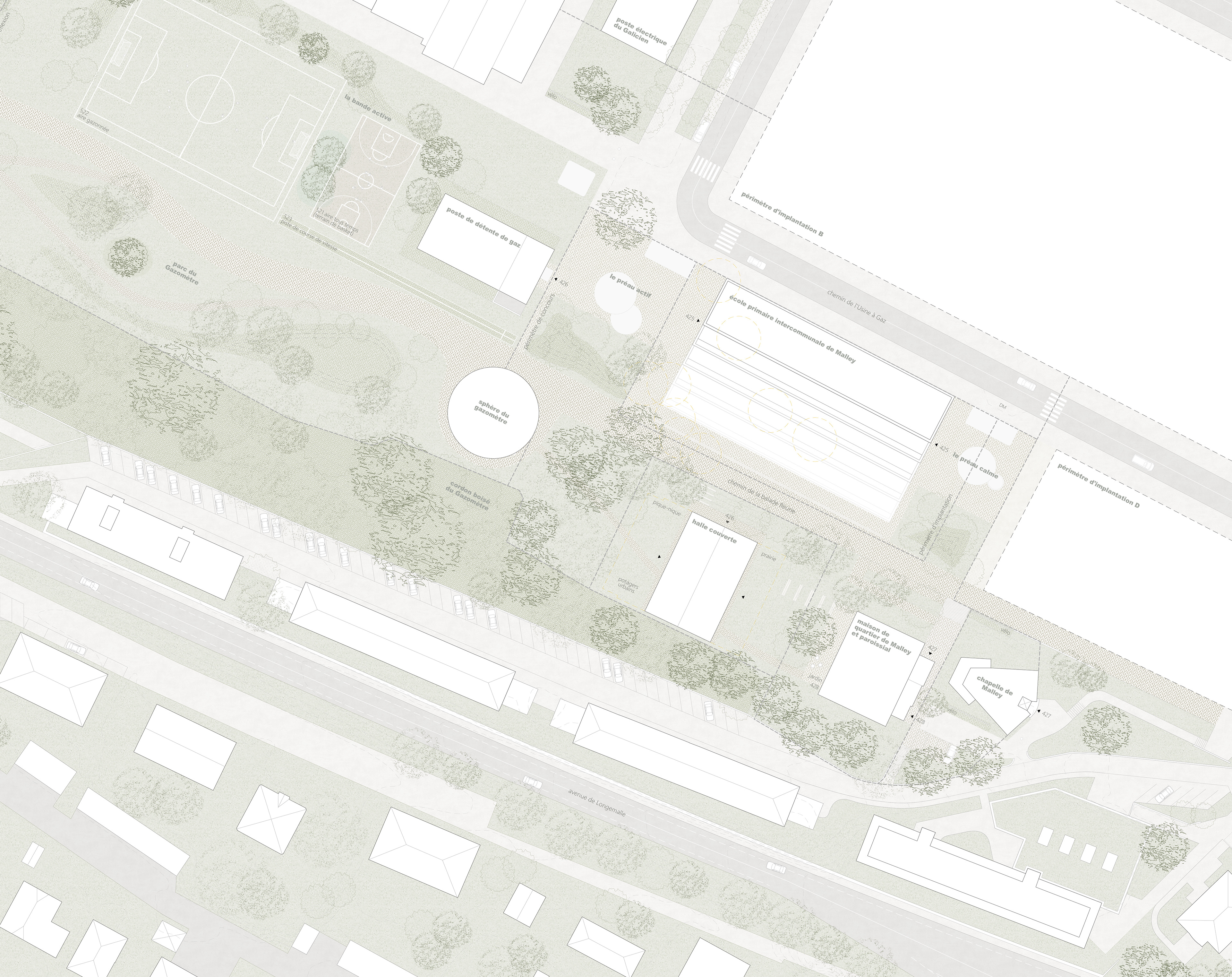 Le projet scolaire de Malley s’insère entre futur quartier dense et coteau boisé, en tirant parti du relief pour définir un bâtiment en gradins. Le socle, au rez-de-chaussée et au sous-sol, concentre l’ensemble du programme sportif, accessible de façon autonome depuis le quartier. Au-dessus, l’école primaire se déploie sur trois niveaux qui s’étagent vers le sud : chaque salle de classe profite d’une orientation privilégiée vers les arbres et d’un accès direct à une terrasse plantée, véritable prolongement pédagogique en plein air. Ce dispositif renforce le lien entre enseignement et nature tout en atténuant l’impact volumétrique du bâtiment. La forme à gradins confère à l’édifice une présence singulière : une véritable infrastructure pédagogique, ancrée dans le site, qui retrouve la force urbaine des écoles publiques du début du XXᵉ siècle tout en répondant aux exigences contemporaines de durabilité et de mixité d’usages.